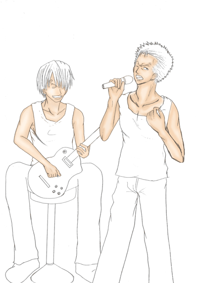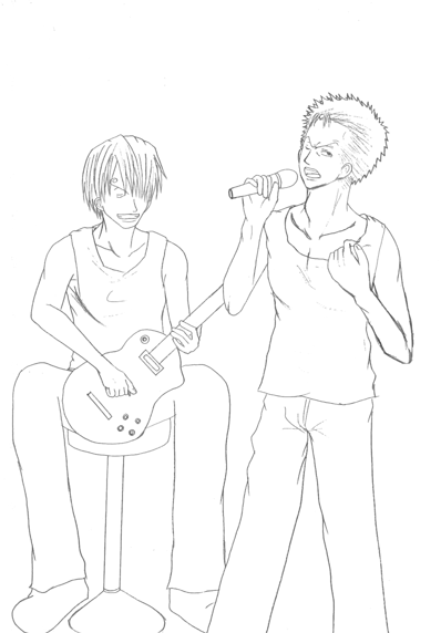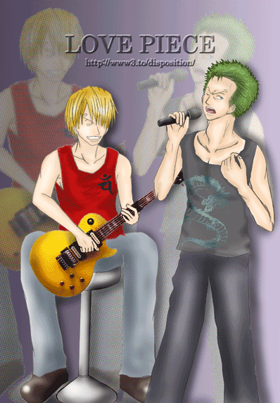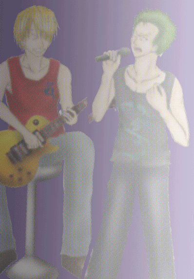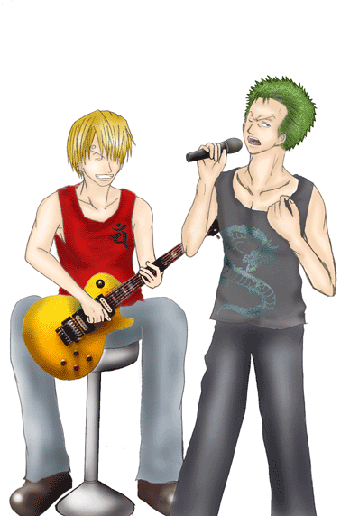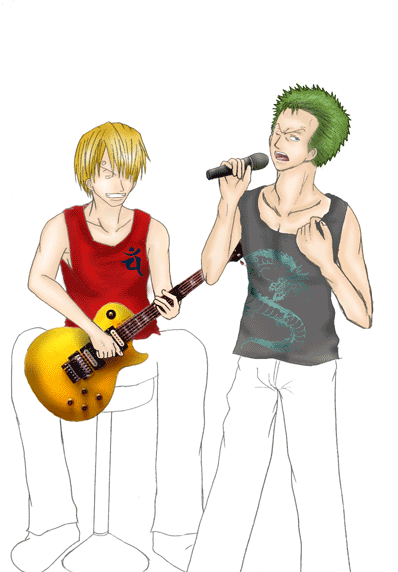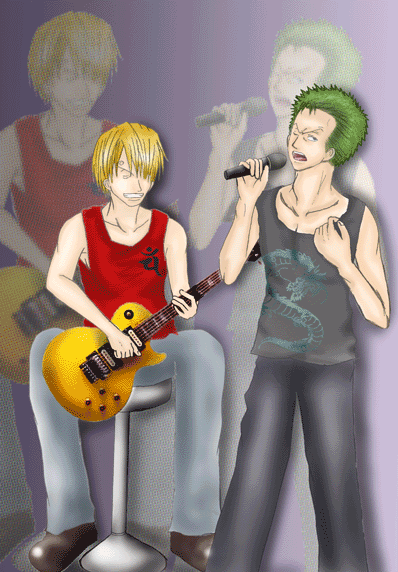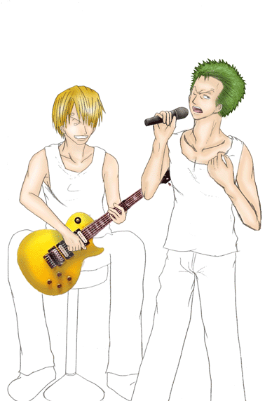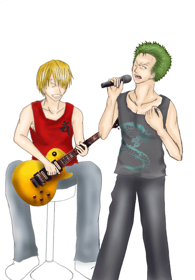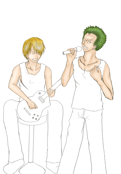 4.色塗り 上の作業をした後に初めて色は塗ります。 私は、肌→髪→小物→服等→その他 の順で塗ります。 始めにベースになる薄い色を塗り、段々と濃い色で順に塗っていきます。 この時に私が注意しているのは、光の当たっている角度。 ゾロは右から光が当たっているのにサンジは左…なんておかしいですよね。 その為に、人物は勿論、小物等も光の当たり方に注意しながら塗っていきます。 着色しながらギターのゆがみ等も修正して行きます。 今回はゾロ、サンジ共にシャツに実際に私の服をスキャナーで取り込み、加工して合成しました。 〔色塗り・肌〕〔色塗り・髪〕〔色塗り・小物〕〔色塗り・シャツ〕〔色塗り・パンツ〕〔色塗り・その他〕〔色塗り・仕上げ〕 |