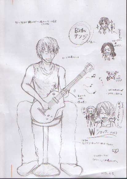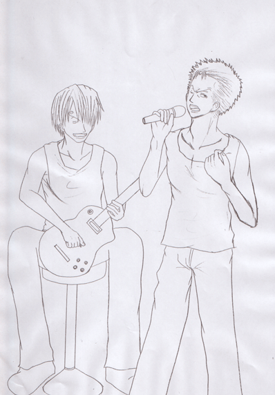 1.ラフ画 先ず始めに簡単なイメージを落書き程度に描きます。 私の場合、数人を描く場合はこの段階では別々に描きます。 市販のコピー紙にシャーペンで簡単に・・・ 飽きたので色々と落書きがしてあります。 〔 ラフ画・ゾロ 〕 〔ラフ画・サンジ〕 |