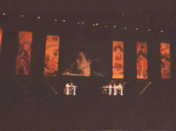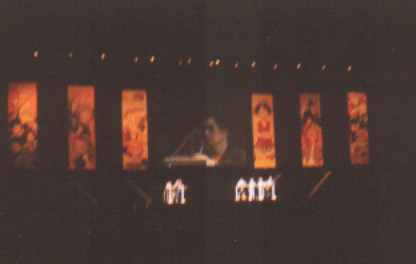 (撮影禁止ですが、フラッシュを焚かずに こっそり隠し撮りしたヒナタです。 左から、司会のお姉さん、矢尾さん、田中さん、大谷さん、中井さんです) 今回は皆同じ髪型(逆立ってました、少しずつとった髪の毛をゴムで結んだ物が10個位作られていました)で統一していましたが、矢尾さんにオデコが広いと指摘され、中井さんはかなり恥ずかしがっていました。 ステージから遠すぎます。 写真だとモニターしか見えませんね… |