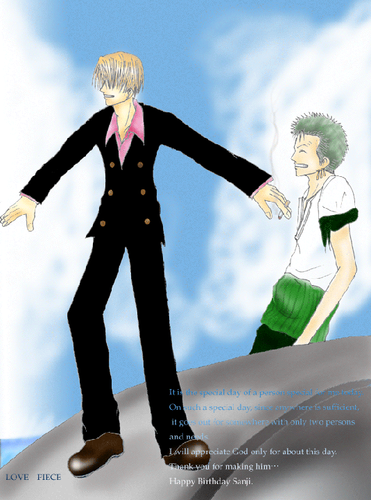 タイトルのまんまですが、海岸デートです。 左下のは海です!!誰が何と言おうが海なんです!!! 最近幸せな絵を描いていなかった所為か描いていてかなりたのしかったです。 ・・・これのラフを仕事場で描いたなんて絶対に言えません!!(駄目じゃん・・・) 場所としては、海岸の砂辺に降りる階段の所。 リゾート地でも良かったのですが、それよりこっちが描きたかったので・・・ またまた無駄に英文付きです。英文はゾロからサンジへ…で考えて頂ければ幸いですv ハッピーバースデーサンジvv
