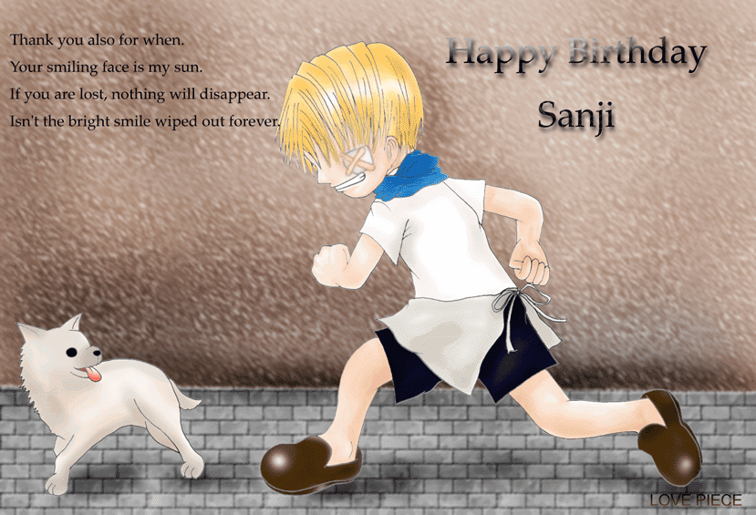 ![]() タイトルのまんまですが、仔サンジと仔犬です。設定としては、 ゼフに頼まれた、停泊中の港でのお使い中に産まれて初めて犬という動物を生で見た。 そんなサンジです。サンジは図鑑とかでしか見たことがなかったのです。 ・・・この後、仲良くなった犬との別れが惜しくてなかなか船に戻らないでいたので、 心配したゼフがサンジを迎えに来ます。(勝手な妄想) ・・・とまぁ、そんな感じです(どんな) またもや英文。 これもまたクサイんですが、勘弁してやって下さい。 更に、違うバージョン(サンジの頬に絆創膏が張ってあります)もありますので、 DLの場合はお好きな方をお使い下さい。別バージョンはこちら。 〜ハッピーバースデーサンジ〜 |