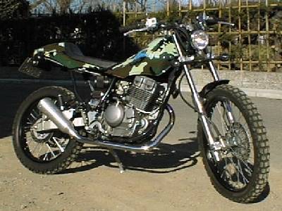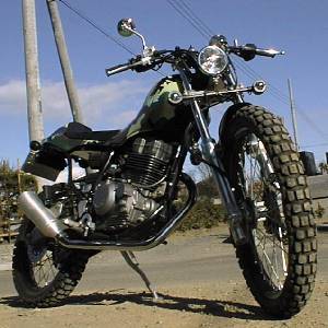 | ツーリングでの休憩中。センタースタンドはけっこー便利だった。 | これが今乗ってるバイク。kawasaki KL250SuperSherpa改StreetBomber仕様。 | 気楽に乗れて良く走る。そんなバイクもけっこー面白いね。でも、やっぱカスタムはいろいろと値段がかさむね。いたずらされないようにしなくちゃあ。 |