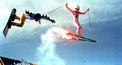 スキーではわざと下手な格好で次々とエクストリームスキーをこなし、パラスキーの人にしがみついてズボンを脱がしながら一緒に空を飛んじゃうんだ。