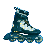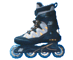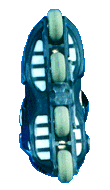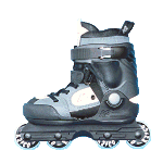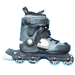こちらはアグレッシブモデルで、スポーツ店じゃあないと売ってないかな?値段もちょっと高め。ウィール径は小さくて重心が低く、ジャンプの着地では安定感が良い。初心者の人なんか逆にこっちのタイプの方が最初滑りやすいんじゃあないかな〜?横へのふらつきも少なくって安定感は良いからね。でも、小石なんかに躓きやすいから荒れた所じゃあちょっと滑りにくい。ソール(靴底の部分)が広く、2番目と3番目のウィールの間が開いているのも特徴で、ここでグラインド系のトリックをやるのさ。ハンドレールの上やカーブ(縁石)を滑るのがそーだけど、なかなか楽しそーでしょ??これはフィットネスタイプの靴でやると壊れそーだもんね。このアグレッシブタイプの楽しみはやっぱジャンプしたりグラインドしたりすることだよね。ランページって入ってみたいと思わない?なんか空を飛べそうだよっ!何処でやるかって?ストリートモデルだけどストリートじゃあ危ないからパークで遊ぶのが一番だ。駐車場程度の広さがあれば練習は出来るしね。このK2のモデルはソフトブーツだからけっこー気に入ってるんだけ