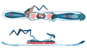 これはプロペラのソフトビンディングタイプ。まだSnow Brade Shoesを持ってなかった頃、ジャンプの着地の衝撃を和らげようとしてソフトブーツで履けるこれを買ったんだ。でもソフトブーツがあまりにも旧式だったためいまいちフィッティングが悪く、横方向へのぶれが気になるんだ。ビンディングの幅が広いからけっこー邪魔だし、たたんでもあまり小さくならないのと専用ケースがないのとで持ち運びも大変だったし、あまり使わなかった。今では貸し出し専用になっちゃった。ソフトブーツしか持ってない人にはいいかもね。 |