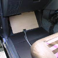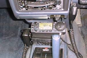 これはHF機ICOM IC−706の配置。HF機もパネルセパレートなんだから便利になったものだね。本体は助手席シート下に置いてあるんだ。左側の写真でディスプレイ下に設置してあるのは電子ホーン及び車外拡声器。助手席側のハンドマイクは拡声器のマイクなんだ。ここで苦労したのはオートアンテナチューナーの設置。写真にあるように助手席足元に設置してその形に合わせて合板を加工して邪魔にならないようにしたんだ。もちろん同軸も直に踏み付けられないようにゴム板で保護してある。ここにこんなものがあるとはみんな気が付かないで乗ってるよ。ここまで苦労したのに最近あまり活躍してないのが寂しい。暖かくなったら移動運用に行かなきゃあね。CWの練習もしないと、エレキーがもったいないし・・・。 |