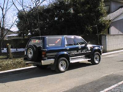 これが私の愛車ハイラックスサーフの外観です。後方のアンテナは6m、2m、430トライバンドで、リヤタイヤキャリアーに取り付けてあるんだ。いや、これじゃあ電波特性が悪いのは十分わかってるんだけど、バランスを考えるとどーしてもここに付けたかった。ルーフに穴開けるのもちょっと・・・。でも、引き込みは5DSFAで直接つないであるんだ。一番苦労したのは6mのSWRを落とす事。1/4λではボンディングしても、キャリアーとボディとのコンデンサー効果のため、どうやっても良好なアースが得られないんだ。綺麗に仕上がるようにはね。それで結局、ちょっと運転に気を使うけど、写真の1/2λのアンテナにしたらSWR1.8位まで下がったんだ。あとは簡単なアンテナカプラーを入れてSWR1.1まで下がった。だから、1/4λの短いアンテナは使えないんだ。かっこつけてるわけじゃあないんだよ。それから、ボンネットに付いてるのはHF〜2mまでのアンテナで、コイルを取り替えるとけっこー多くのバンドに対応できるやつなんだ。写真では7メガ、21メガのコイルを付けて+6m