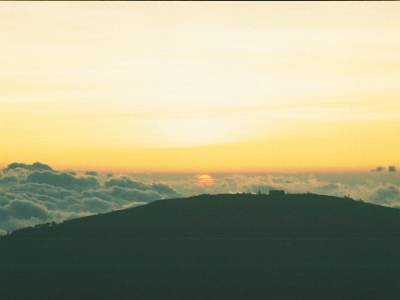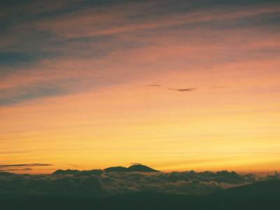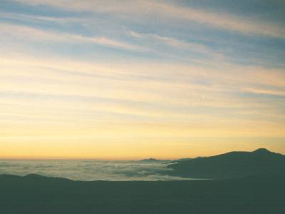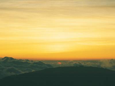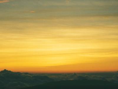 雲海の海面下に卵の黄身のような物が見えてきた。まだあまり明るくないけど、不思議な光が辺りを包み込んだ。雲海の端が輝き出す。みんなで息を呑んで見つめ続けていた。 |
