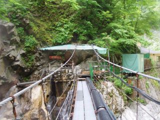 しばらく歩くと、崖っぷちに何かが見えます。そう、あれが黒薙温泉の「天女の湯」通称「崖っぷち温泉」(こんな言い方私だけかも知れませんが・・・) 川に架かる吊り橋も気になります。ワクワクしてきました。さぁ、先に進みましょう! |