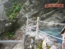 もったいないようですが、湯船から溢れたお湯は谷底へ一直線。 なんとも贅沢ですね。高所恐怖症の人は下を覗き込まない方が・・・安全の為ですよ(^-^) |