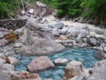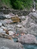 本当ならば青く澄んだ清流を見ながら入浴できたかと思います。この大露天風呂までは旅館から徒歩で約1〜2分です。ちなみに脱衣所は左に見える緑色のテントで、 男女別になっています。 |