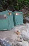 | やはりここでの脱衣所は右の緑色のテントです。ここまでは旅館の裏口辺りから、崖沿いの舗装道を歩いて約30秒です。 |