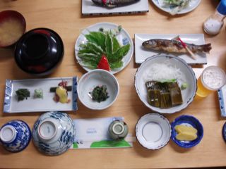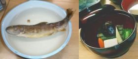 椀物・野草天ぷら・岩魚・山菜・ホタルイカ・刺身(昆布じめ)とその程度ですが、山の幸を堪能できます。追加注文で岩魚の骨酒等があります。 |