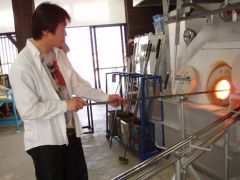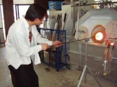 今度は台に座り、表面を整えてきますが、常にパイプは回し続けます。パイプの先に近い方は火傷するくらい熱いので、触らないように注意しましょう。 (コップを作る時は、立った姿勢で振り子のようにパイプを振り、ガラスを縦長にする工程があります) |