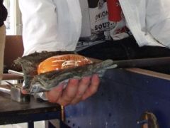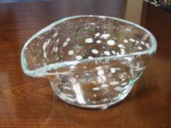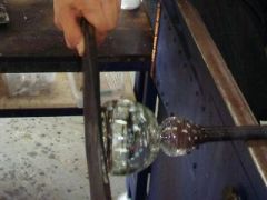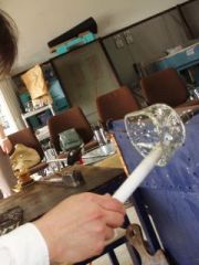 くびれている部分が作った部分です。その後木の板で底を平らにします。 この後職人が「ポンテ竿」と呼ばれる竿を底面に付け、くくりから切り離した後、 ガラスがパイプからポンテ竿に移る準備をします。 切り離し方は簡単。事前にくくりの部分に割れ易い様、職人が傷を付けてくれます。 ポンテ竿が付いたらパイプの先の方を叩き、くくりの部分を割ります。 するとポンテ竿にガラスが移るというわけです。 ちなみに割れた所はコップや小鉢の「ふち」になります。 |