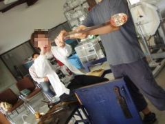 | この後少し1度パイプを吹いて膨らませます。 これで「下玉」と呼ばれる物が作れます。 色付けは粉末を作業台の上で転がして付着させます。 先端がグラスの底になるので、色の付き方等をイメージしながら作業しましょう。 また、私はガラスの中に気泡を入れたかったので、その工程もありました。 何と料理で使う「ベーキングパウダー」を降りかけると気泡が入るとのです。 |