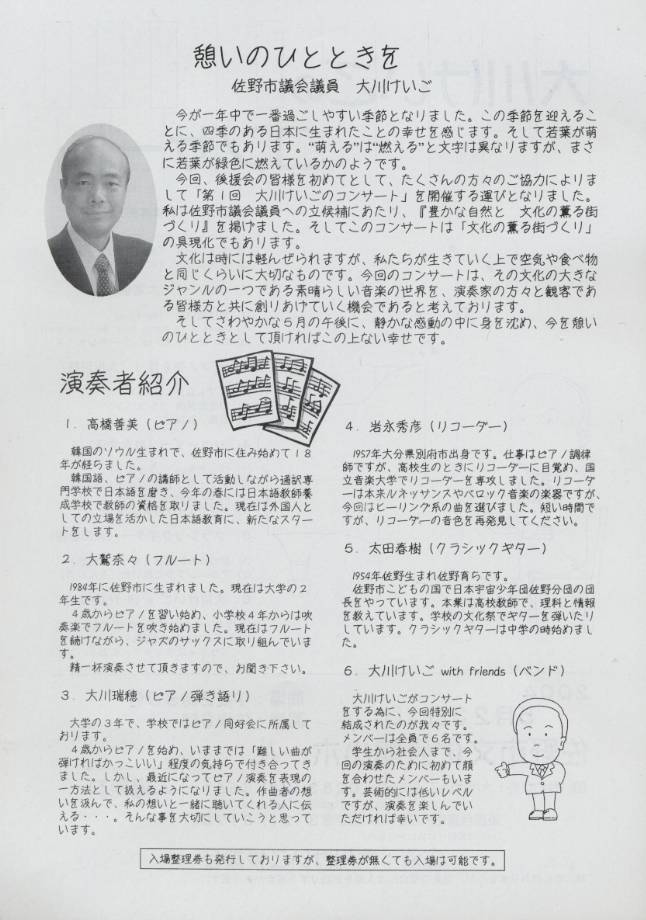 では、本当の音楽とは何でしょうか。私はこう思うのです。ここに演奏家がいます。そしてその前にそれを聞くたくさんの人たちがいる。聞く人が1人と、今回みたいに何百人といる場合では、演奏家が受ける心理的影響が異なります。その影響の差は必ず演奏する音に違いが出てくるはずです。つまり音楽は演奏家だけが創り出すものでは無いのです。そしてもう一つ、文化会館と言う場と今と言う時間、つまり演奏家とそれを聞く人たち、それに場と時間の3つが一つになった時に本当の音楽が創られるのだと思います。