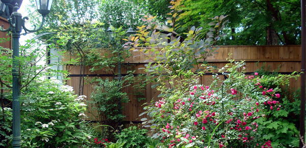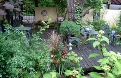 | 2008 ガーデン風呂へ続く小路の山アジサイと蔓バラ |