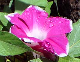 朝4時過ぎ頃から、まるであくびをしているように 花びらをいっぱいに広げ、夏の大空に大きな声を 出しているように思えます。 その花の中を覗くと、左のように雄しべと雌しべが あります。 雄しべは、5本(時に6.7.8本)あります。 花は、お昼過ぎにはしぼんでしまいます。 昆虫などが花に入らなくても、一月もすると種が できます。 この秘密を探ってみましょう。 |