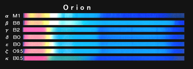 オリオン座の恒星のスペクトル 暗線が良く見えない場合は、CRTの明るさを高めてください。