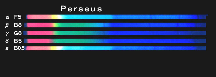 ペルセウス座の恒星のスペクトル 暗線が良く見えない場合は、CRTの明るさを高めてください。
