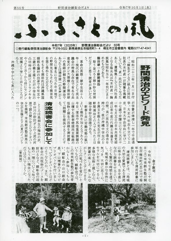 ・野間清治似顔絵応募 吾妻高校へのお礼と「野間清治先生」の碑 原沢礼三 ・ふるさと桐生とわたくし(二) 行田市 米山 稔 ・第4回生誕の日祭 記念館準備室長 山口耕一 ・野間清治似顔絵展 ・森寅雄の故地を訪ねて 事務局長 大瀬祐太 ・編集後記 |