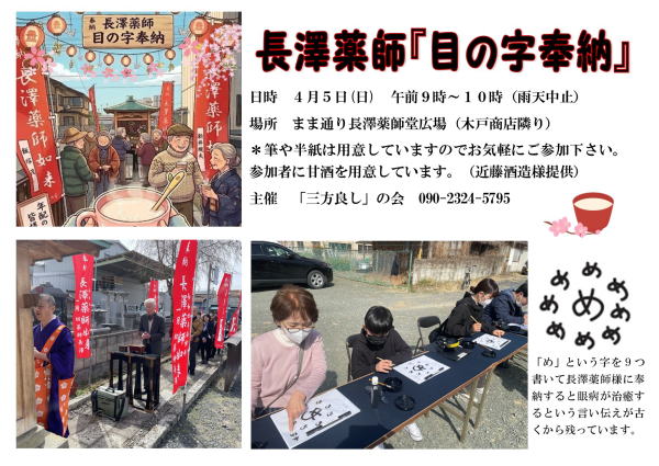 上の写真が普段の長澤薬師の様子。この写真を元にして、「目の字奉納の縁日で、お年寄りたちが楽しそうに甘酒を飲みながら歓談している様子をイラスト風に」とAIに指示を出し、「夜の縁日ではなく朝」とか、「秋ではなく春の雰囲気」など、修正を加えて出来上がったのが下のような画像です。