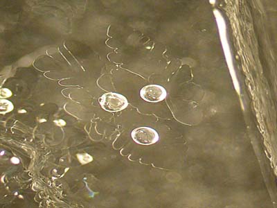 ○ その泡の周りをよく観察すると、雪印の結晶のように模様が成長していくのが見られます。