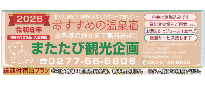老人会、同窓会、趣味の会などのグループ旅行に。またたび観光企画