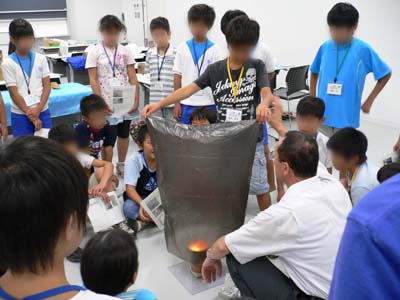 熱気球の実験は気温の低い冬場が適しています。ポリ袋の下にワイヤーでゴンドラを吊し、その中でアルコールを燃やすのが一般的です。しかし、気温が30℃を超える夏場は、それではうまくいきません。