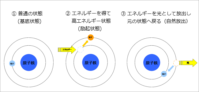 です。さらに、高エネルギー状態の原子・分子が非常に多く存在すると、この誘導放出が次々と発生し、多量の光が放出されます。